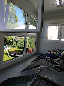 We stayed at the spa all day on Monday. We swam in the various thermal pools, one of which was a lazy river. At one point, the Bademeister turned up the flow rate, creating a wild white water river, which really dunked us underwater. My favorite pool was the Active pool, which was cool and refreshing: about 84 degrees. I also loved the Rest Pavilion -- very comfortable lounge chairs in a quiet pavilion, with mountain breezes drifting in the large windows.